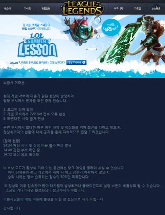 이어 "로그인 장애 발생, 게임 로비에서 PVP.Net 접속 오류 현상, 빠른 대전 시작 불가 현상이 나타난다"며 "오후 2시 34분 채팅 서버 및 상점 이용 불가 현상 발생, 오후 2시 40분 관련 부서 확인 중, 오후 2시 52분 보상 모드 활성화"라고 장애 현황을 전했다.