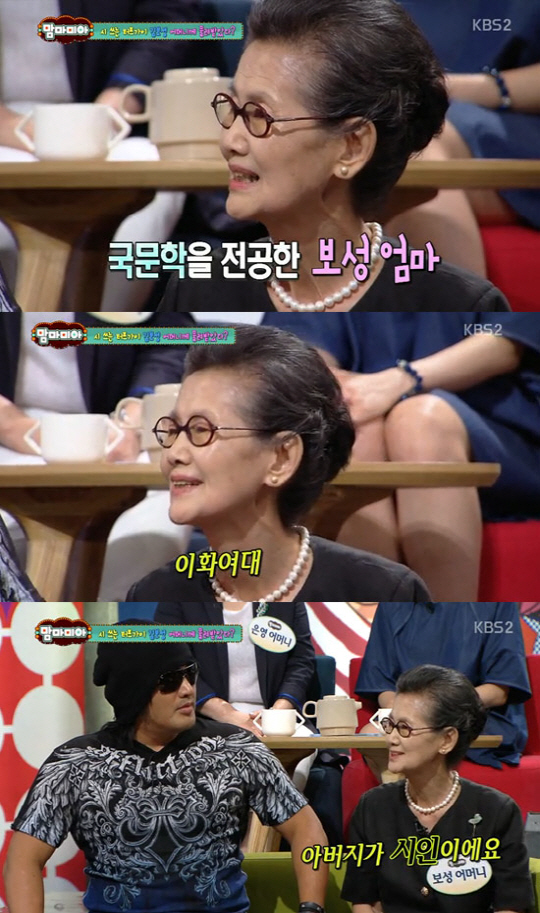 이날 방송에서 MC 박미선은 김보성을 향해 "의리를 외치시는 김보성씨가 의외로 시를 쓰신다. 예민하시다"며 말문을 열었다. 이어 MC박미선은 "어머님께서 제가 알기로는 국문학을 전공하셨다고 들었다"고 전하자, MC 이영자는 "어느 학교 국문학이었냐"고 콕짚어 질문을 했다. 그러자 김보성의 어머니는 "이화여대 국문학을 전공했다"고 말해 눈길을 끌었다.
