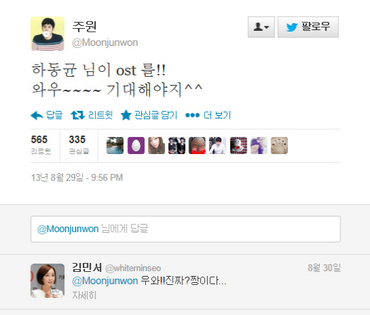 이어 배우 주원과 함께 드라마 '굿닥터'에 출연해 성원대 기획조정실 실장인 '유채경'역을 맡은 배우 김민서는 주원의 글에 "우와 !! 진짜 ? 짱이다...."라는 댓글을 달으며 하동균의 OST 참여에 높은 기대감을 보였다.