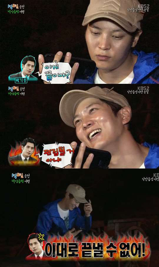 '1박2일' 녹화중이라는 사실에 박기웅은 깜짝 놀라며 주원이 몇 마디 하지 않고 전화를 끊으려 하자 "이게 끝이야? 뭐 해야지 퀴즈를 내든가. 편집 될 거 아냐. 이대로 끝낼 수 없어"라며 격한 반응을 보여 시청자들에게 웃음을 선사했다.