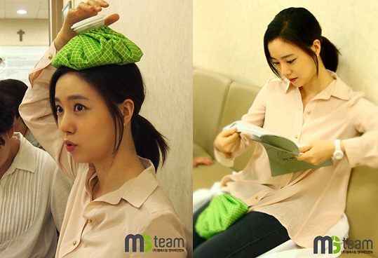 공개된 사진 속 문채원은 병원에서 촬영대기 중인 모습. 더위에 지친 듯 얼음주머니를 머리 위에 올려놓는가 하면, 대본에 열중할 때도 얼음주머니를 놓지 못하고 있다.