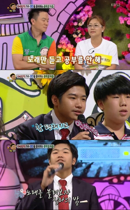2일 방송된 KBS 2TV '안녕하세요'에서는 박희경씨가 출연해 '신라의 달밤'으로 유명한 가수 현인을 흉내 내는 15세 애늙은이 중학생 아들 때문에 생긴 고민을 털어놓았다.