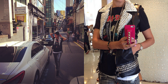 공개한 사진 속 변정수는 검정 스키니 팬츠에 가죽조끼, 반짝이는 액세서리까지 락 스피릿을 자랑하는 스타일링으로 길거리를 활보 하고 있다.