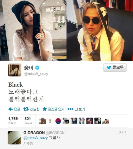 빅뱅 지드래곤과 미쓰에이 수지의 쿨한 트위터 대화가 화제다.