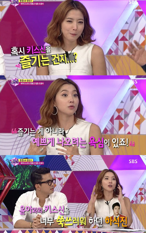 이날 MC 신동엽은 오윤아에게 "유부녀지만 정말 키스신을 잘한다는 말이 있다. 즐긴다는 말이 있던데.."라고 운을 뗐다.