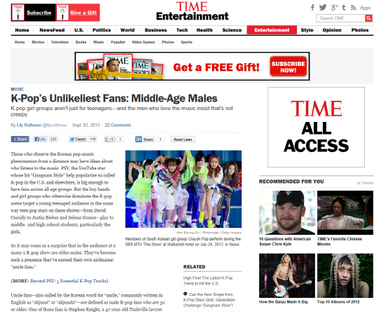 미국 시사주간지 타임은 지난 2일(현지시각) 'K-POP의 의외의 팬: 중년 남성(K-Pop´s Unlikeliest Fans: Middle-Age Males)'라는 제목의 기사를 통해 K-POP의 중년 남성 팬들에 대해 보도했다.