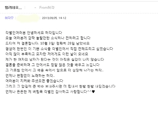 "여러분께 깜짝 놀랄만한 소식 하나 전하려고 합니다"라고 운을 뗀 그는 "드디어 저 결혼합니다. 10월 3일! 정확히 28일 남았네요. 평생에 한 번인 이 기쁜 소식을 각별인(허각 팬클럽)에서 직접 전해드리고 싶었습니다"라고 밝혔다. 이어 "아직 많이 부족하고 모자란 저에게도 이런 날이 오네요. 제가 한 여자의 남자가 된다는 것이 아직은 실감이 나지 않습니다. 결혼을 준비하며 그 안에서도 정말 많은 걸 배우고 느낍니다. 그 가르침 안에서 그 배움 속에서 앞으로 더 성장해 나가는 허각. 언제나 변함없이 노래하는 허각. 여러분이 지켜봐 주셨으면 좋겠습니다"라고 전했다. 또 "그 앞길에 큰 박수 보내주시면 더 힘내서 한발한발 내딛겠습니다. 언제나 든든한 제 버팀목 각별인 감사하고 사랑합니다"라고 덧붙였다.