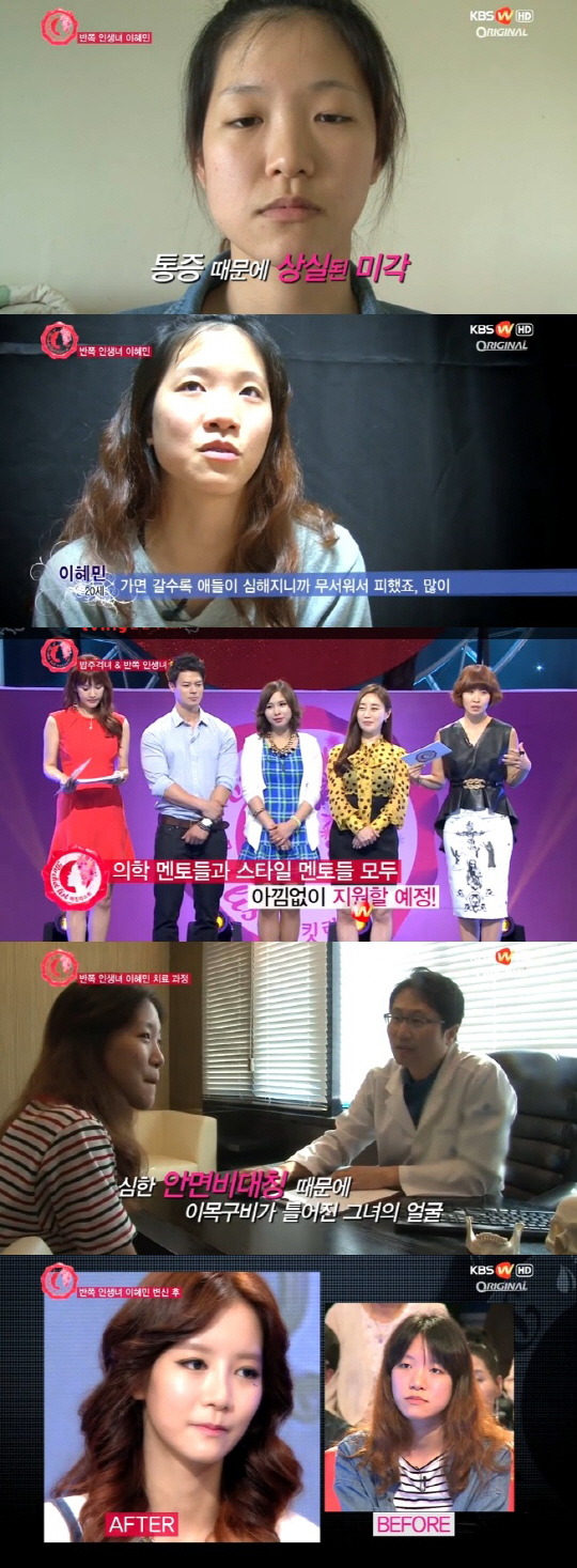 5일 첫 방송한 케이블채널 KBS W 메이크오버 프로그램 '버킷리스트'에는 안면 비대칭으로 고생하고 있는 '반쪽인생녀' 이혜민 씨를 첫 주자로 내세웠다.