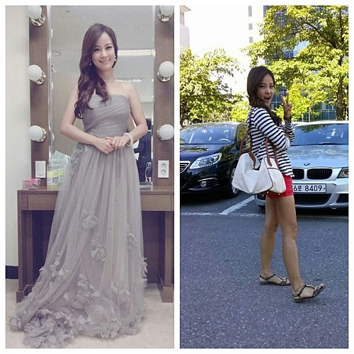 한쪽 사진에는 우아한 회색빛 드레스를 입은 여신 포스의 김지민이, 다른 사진에는 굽없는 샌들을 신고 다소 짧아 보이는 신장이 강조된 평상복 차림의 김지민이 담겨 있다.