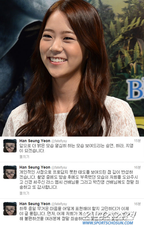 한승연은 5일 밤 자신의 트위터에 "하루 종일 무거운 마음을 어떻게 표현해야 할지 고민하다가 이제야 글 올립니다"라고 말문을 연 뒤 "먼저, 어제 저희가 게스트로 참여한 라디오스타로 인해 불편하셨을 여러분께 정말 죄송하다고 말씀드리고 싶습니다"라고 사과했다.