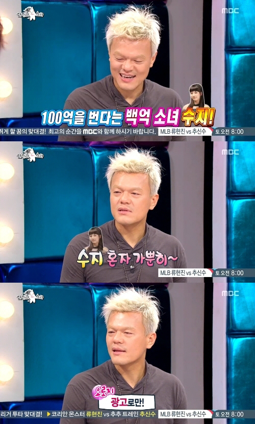 이날 MC윤종신은 "수지가 100억을 번다고 해서 100억 소녀라는 말이 있다"며 박진영을 향해 질문을 던졌다. 그러자 박진영은 "혼자 가뿐히 그 정도는 넘긴다. 광고로만 그 정도를 번다"고 말해 MC들의 입을 쩍 벌어지게 했다.