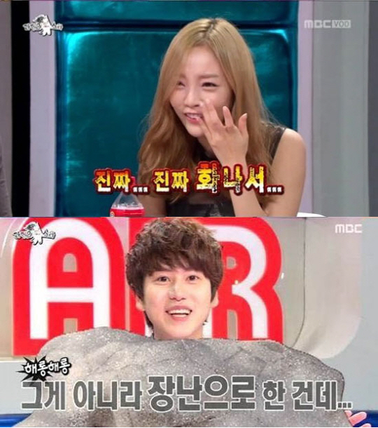 그러자 MC규현은 "제가 입 열면 구하라 다 끝난다"고 장난스러운 선전포고를 던지자 구하라는 자리에서 일어나 "오빠도 당당하지 못 하자나요"라며 규현에게 물통을 던지며 버럭 화를 내더니 끝내 눈물을 흘렸다.