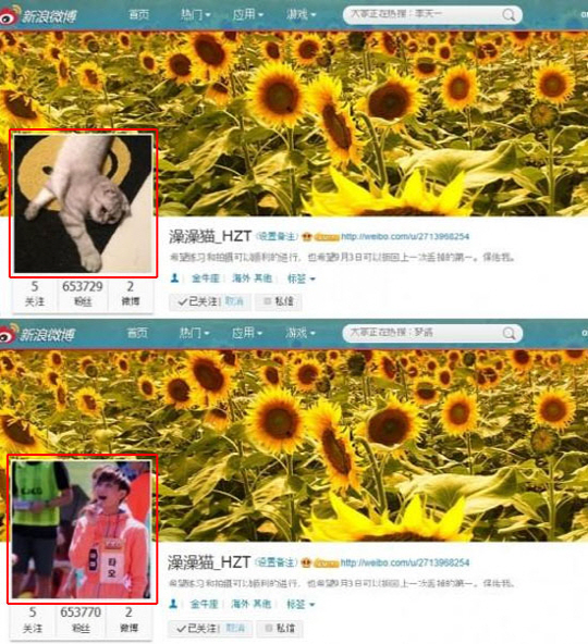 엑소 멤버 타오의 웨이보 프로필 고양이 사진에 관심이 집중되자 타오의 프로필 사진이 변경됐다.