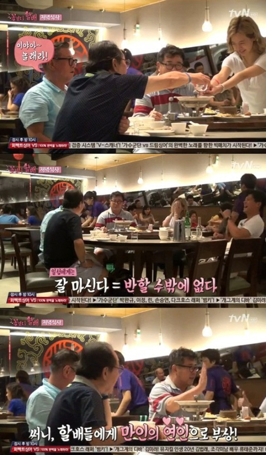 저녁식사 자리에서도 써니는 인기만점이었다. 할배들이 주는 술을 잘 받아 마시며 더욱 큰 사랑을 받았다.