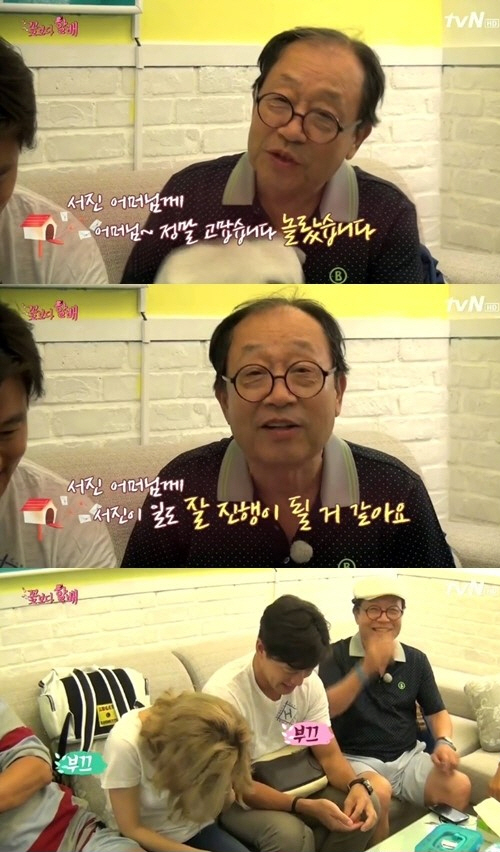 '꽃보다 할배' 신구가 '짐꾼' 이서진의 어머니에게 영상편지를 띄워 웃음을 선사했다.