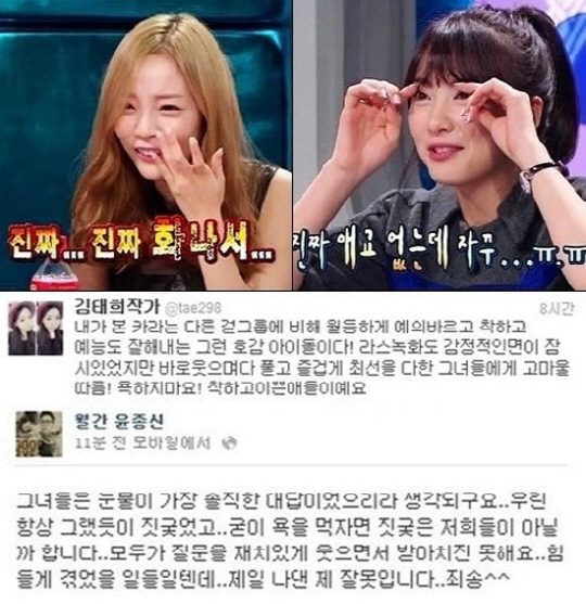 이는 앞서 4일 '라디오스타'에 출연한 카라 구하라, 한승연, 강지영이 MC들의 짓궂은 농담을 다소 감정적으로 대응해 태도논란을 빚은 데 대한 글이다. 이날 구하라는 연애돌 질문에 난감해하다 끝내 MC 규현에게 물병을 던지고 울음을 터뜨렸으며, 막내 강지영도 "애교를 보여달라"는 요청에 "애교가 없다"며 눈물을 보여 보는 시청자들을 의아하게 하는 등 방송후 구하라의 태도논란과 강지영 눈물이 구설수에 올랐다.