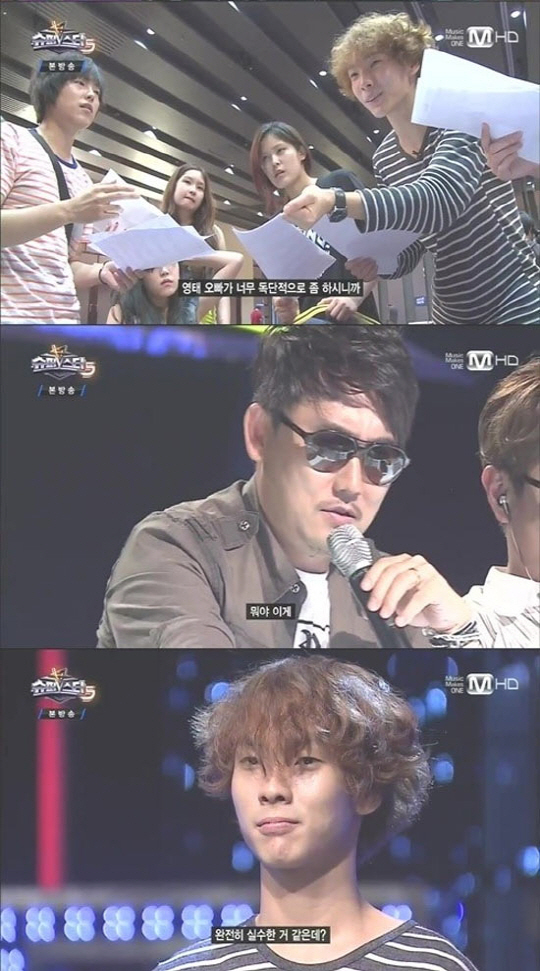 이에 무대로 나선 최영태는 자신의 기대와 달리 심사위원들의 혹평에 당황했다. '슈스케5' 심사위원 이승철은 "뭐야 이게. 편곡 누가했나? 이 상큼한 조를 이렇게 망가트릴 수 있냐. 완전히 실수한 것 같다. 뮤지컬도 아니고 손발이 오그라든다"라고 평가했고, 심사가 끝난 후에도 이승철은 "저런 애들은 안 된다. 영태 쟤는 진짜 잘하는데 매번 저런 식으로 해서 탈락이다"라고 안타까워했다.