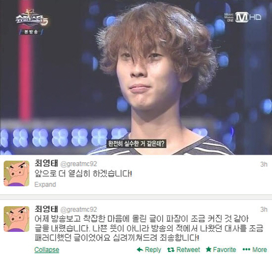 이는 7일 새벽 자신의 트위터에 "방송국X들, 복수할거다"는 글과 "컨트롤 비트 다운 받을 거야"라는 댓글을 남기며 탈락의 아픔을 드러낸 것이 알려지며 비난을 받았기 때문. 특히 최영태의 '컨트롤 비트' 탈락소감은 최근 불거진 '힙한 디스전'에서 래퍼들이 디스곡으로 사용한 빅션의 곡으로 '복수할거야'라는 의미로 해석돼 비난을 받았다.
