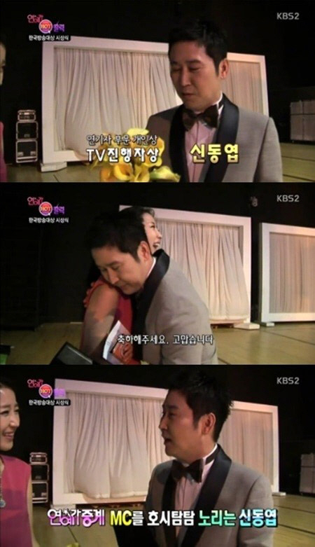 이어 수상 세리머니를 해달라는 제안에 신동엽은 "축하해주세요. 고맙습니다"라며 인터뷰를 진행하던 리포터를 끌어안는 돌발행동을 해 눈길을 끌었다.