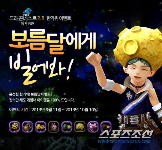 한편 한가위를 맞아 '보름달에게 빌어봐' 이벤트를 오는 10월 10일까지 진행한다. '드래곤네스트' 게임에 접속하는 시간에 따라 30분 단위로 '풍요의 상자'를 제공하며, 상자 안에는 다양한 버프 효과가 작용하는 '꿀 송편', '호박 송편', '쑥 송편'과 영구적으로 사용 가능한 '동전'을 랜덤하게 획득할 수 있다. 또 3종의 송편을 모아 배달하는 일일 미션을 통해 추가로 '동전'을 제공하며, 모은 '동전' 갯수에 따라 게임 내 고급 아이템 '보름달 모자' 등으로 교환해 주는 이벤트를 진행한다. 남정석 기자 bluesky@sportschosun.com