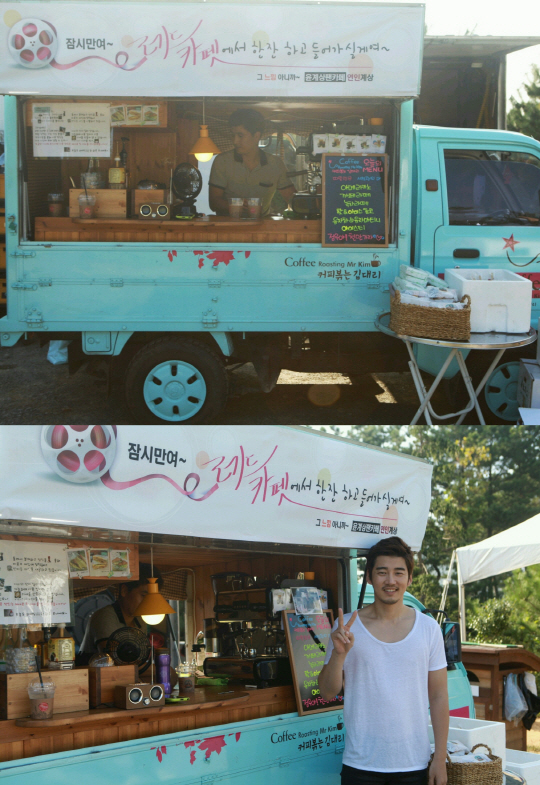 영화 '레드카펫'을 촬영 중인 영화배우 윤계상이 팬클럽 회원들로부터 간식차를 선물받았다. 사진제공=사람엔터테인먼트 |