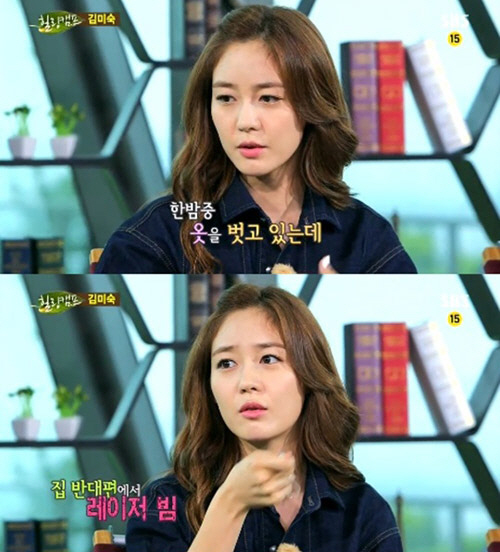 그러자 핑클 출신의 MC 성유리 역시 "나도 그런 적이 있었다. 나는 핑클로 활동 당시 늦은 시간까지 스케줄을 마치고 집에 와서 옷을 갈아입는데 몸에 빨간 점 같은 것이 있었다"며 "알고 보니 건너편 집에서 내 몸에다가 레이저 불빛을 쏘고 있었던 거다"고 섬뜩했던 당시 상황을 설명했다.