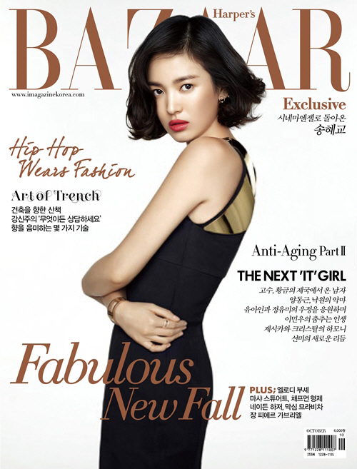 또한 송혜교는 '바자' 코리아뿐만 아니라 차이나 10월호의 커버 촬영도 함께 진행해 국내에서 유일하게 처음으로 같은 달 '바자' 코리아, 차이나 커버를 장식한 여배우가 됐다. 차이나 커버는 코리아 커버와는 완전히 다른 느낌이라 송혜교의 팔색조 매력을 동시에 만나볼 수 있다.