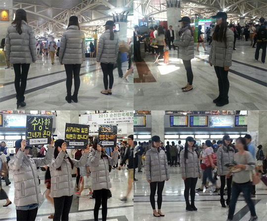 사진에는 SBS 새 월화드라마 '수상한 가정부'에서 박복녀 역을 맡은 최지우의 복장과 헤어스타일을 똑같이 한 세 명의 여성이 나란히 서 있는 모습이 담겨 있다. 검은색 레깅스에 패딩점퍼, 모자를 깊게 눌러쓴 세 여성은 사람들 사이에서 무표정한 얼굴로 무언가를 응시하고 있는 모습. 언뜻 보면 마치 최지우가 3명인 것 같은 착각을 불러일으켜 눈길을 끌고 있다.