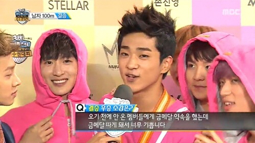 상훈은 "멤버들에게 금메달 약속을 했는데 금메달을 따서 기쁘다"며 세리머니로 '꿀 복근'을 공개했다. 은메달을 딴 민혁은 "이 은메달을 같은 소속사인 비스트의 양요섭에게 바치겠다"는 이색 소감을 밝혀 눈길을 끌었고, 동메달을 목에 건 호야는 연속으로 메달리스트가 되며 명실상부한 '체육돌'의 면모를 과시했다.