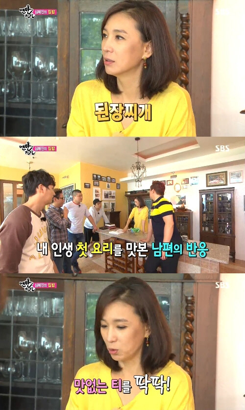 이날 심혜진은 남편에게 해준 첫 집밥 메뉴가 된장찌개였다고 밝혔다. 심혜진은 당시 남편의 반응에 대해 "보통 맛이 없어도 먹어주는데 한 숟갈 뜨더니 내려놨다. 속으로 미쳤나 싶었다. 어떻게 이렇게 무례한 짓을 할 수 있나 싶었는데, 정말 맛이 없었다고 하더라"고 털어놨다.