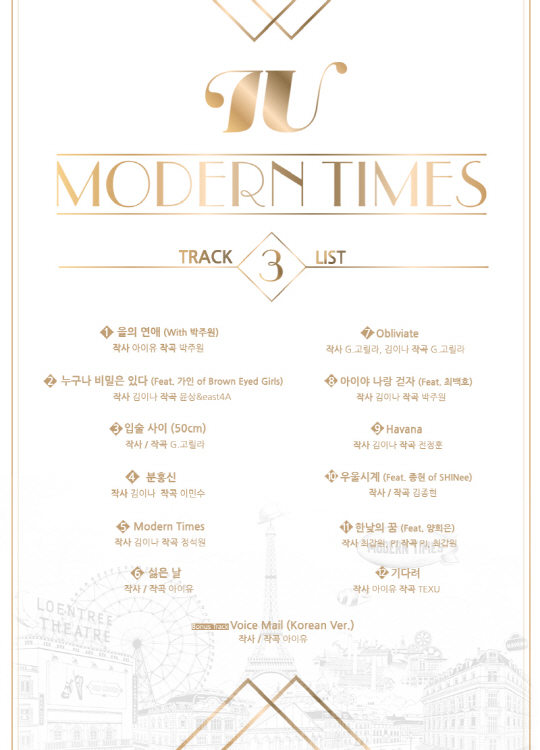 오는 10월 7일 컴백하는 아이유가 3집 앨범 '모던타임즈(Modern Times)'의 수록곡인 '입술 사이(50cm)'의 티저 영상과 함께 트랙리스트를 공개했다.