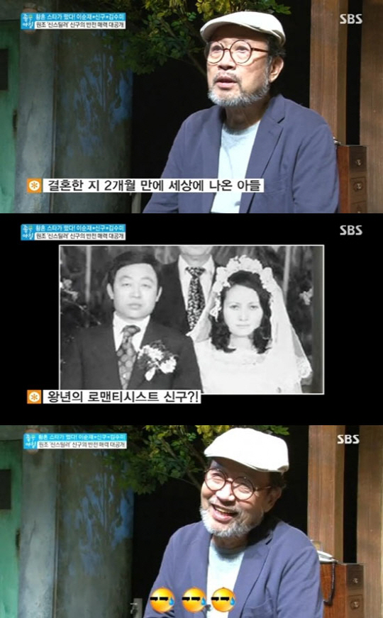 한편 신구는 지난 방송에서 속도위반 사실에 대해 고백한 바 있다. "6년 연애에도 결혼 약속이 없어 아내가 미국으로 떠났다. 계속 편지를 보내 아내의 마음을 돌렸다. 연애하며 정이 들었는데 결혼 얘기가 없자 아내가 서운했나보더라. 미국에 있는 언니에게로 훌쩍 떠나버렸다"고 설명했다.