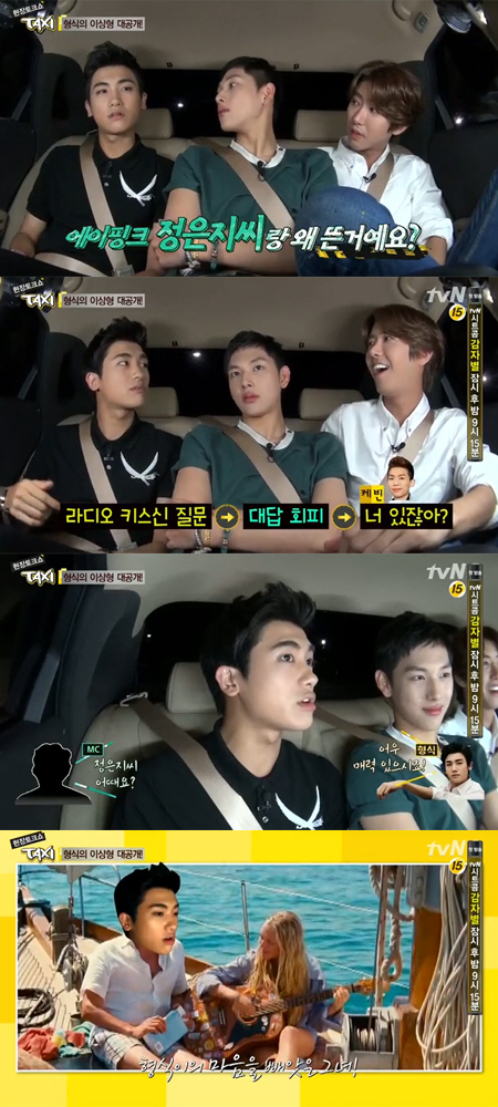 이에 광희는 "얼마 전 기사가 떴는데 정은지랑은 왜 뜬 거냐"고 물었다. 그러자 박형식은 "라디오에서 키스신 질문이 나오길래 내가 대답을 피했다. 그러니까 다른 멤버 케빈이 '너 있잖아'라고 말해서 '대체 누굴 말하는 거냐'고 말하다 에이핑크 얘기가 나왔다"며 "그러자 MC가 '키스신 하고 싶다고 하지 않았냐. 에이핑크 중 누가 제일 맘에 드냐. 정은지 어떠냐'고 하길래 '매력 있고, 연기도 잘하는 것 같다'고 말한 건데 일이 이렇게 됐다. 이제 아무 말도 안 하려고 한다"며 토로했다.