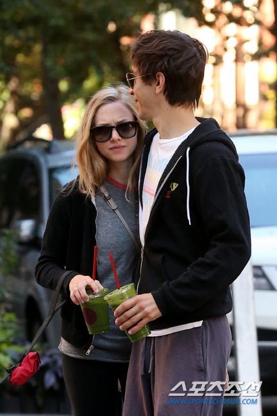 트레이닝복을 입은 편안한 차림의 두 사람은 나란히 주스를 들고 거리를 걷고 있는 모습. 아만다 사이프리드와 저스틴 롱은 사랑에 푹 빠진 듯 산책 중 다정하게 포옹을 나누기도 했다.