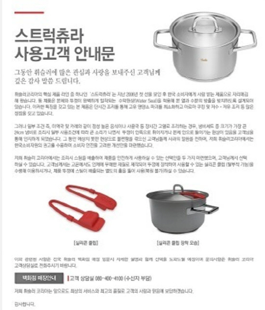 스트럭츄라 냄비 세트 4개 제품 가운데 크기가 가장 큰 하이스튜팟 냄비(직경 24㎝, 6.8ℓ, 양수)에서만 이 같은 문제가 발생했다.