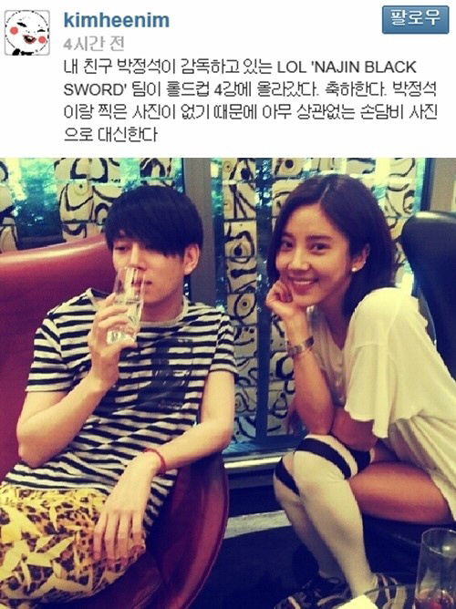 김희철은 24일 자신의 인스타그램에 "내 친구 박정석이 감독하고 있는 LOL 'NAJIN BLACK SWORD' 팀이 롤드컵 4강에 올라갔다. 축하한다"라며 "박정석이랑 찍은 사진이 없기 때문에 아무 상관 없는 손담비 사진으로 대신한다"라는 글과 함께 사진을 게재했다.