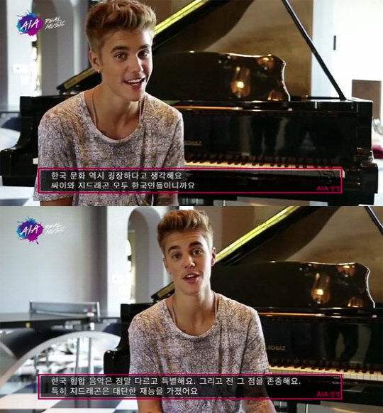 공개된 영상에서 저스틴 비버는 '한국에 대한 기대감'이란 질문에 대해 답하던 중 싸이와 지드래곤을 꼽았다.