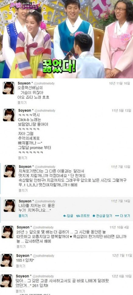 클릭비 출신 가수 오종혁과 걸그룹 티아라 소연이 열애를 인정한 가운데, 과거 소연의 트윗글이 새삼 화제다.