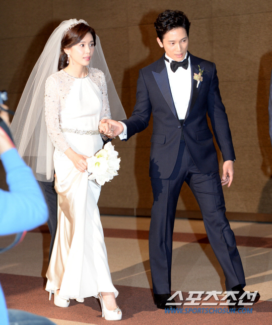 두 사람은 수많은 취재진들에 둘러싸여 뜨거운 플래시세례를 받으며 행복한 마음을 드러냈다. 특히 이날 이보영은 시스루 소재의 순백 웨딩드레스를 입고, 청순하면서도 특유의 단아한 매력을 발산하며 아름다운 신부의 모습을 자랑했다.