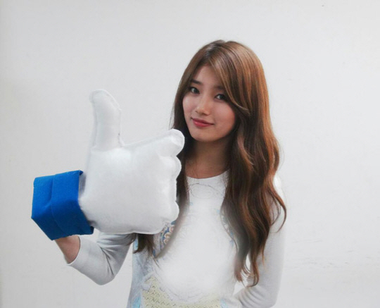 해당 사진 속 수지는 '왕엄지'를 든 채 화이트 의상을 입고 미소를 짓고 있는 모습. 수지가 들고 있는 엄지를 치켜든 손모양은 페이스북에서 호감을 표시하는 '좋아요' 표시로 사용된다.