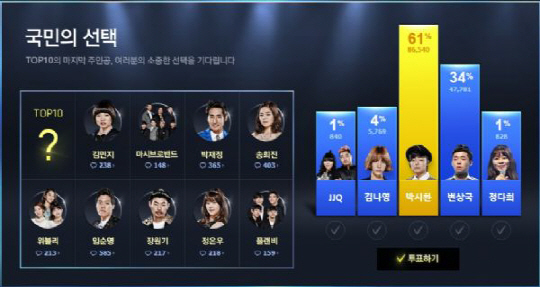 '슈스케5' 제작진은 지난 28일 방송에서 최종 탈락한 5팀 중 시청자 투표를 통해 생방송 무대 진출자를 뽑는 '국민의 선택' 제도를 신설했다고 밝혔다. 현재 탈락자인 제이제이큐, 박시환, 변상국, 정다희, 김나영을 대상으로 투표가 진행중이며 박시환이 61%의 지지율로 1위를 달리고 있다.