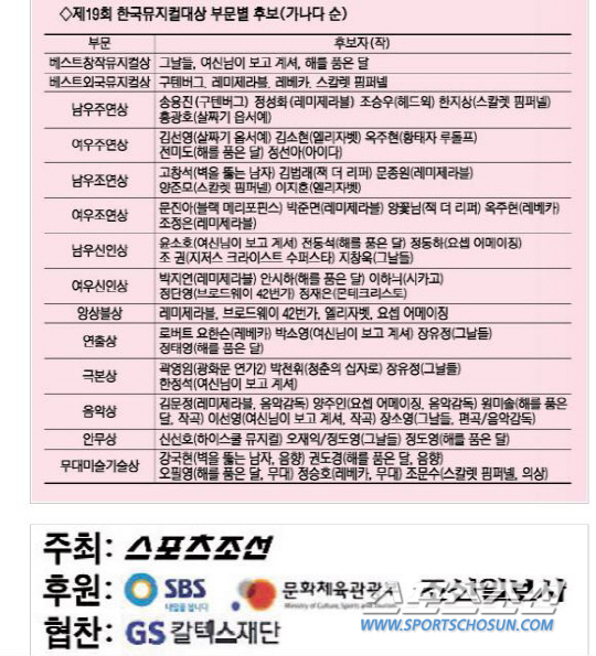 유준상과 오만석이 함께 진행하는 제 19회 한국뮤지컬대상시상식은 한 해 국내 뮤지컬을 총결산하는 축제의 장이다. 올 한 해 팬들의 사랑을 받았던 히트 뮤지컬의 화려한 갈라쇼와 더불어 베스트창작뮤지컬상, 베스트외국뮤지컬상, 남녀 주연상 등 총 15개 부문에 걸쳐 최고의 활약을 펼친 배우와 작품이 탄생하는 감동의 장면이 펼쳐진다. 시상식 현장은 당일 SBS TV를 통해 생중계된다. 김형중 기자 telos21@sportschosun.com