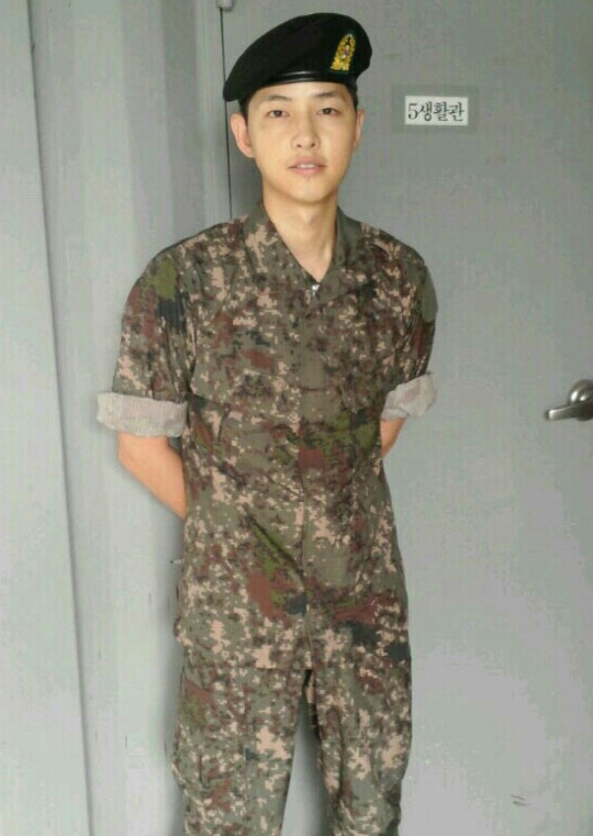 공개된 사진에는 군복을 입고 있는 '군인' 송중기의 모습이 담겨 있다. 훈련병인 송중기는 입대 때 보다 다소 살이 빠진 마른 몸에 군기가 바짝 든 긴장한 미소를 머금고 있다.