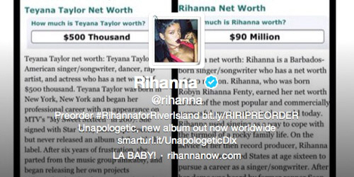 하지만 리한나는 계속해서 자신의 트위터 표지사진을 자신의 수입과 테일러의 수입을 비교한 사진으로 교체하는 등 티아나를 조롱하는 행동을 그치지 않았다.