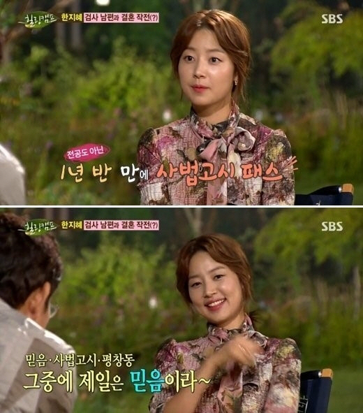 특히 한지혜는 "남편은 서울대학교 공대출신이다"며 "법 공부를 1년 반해서 검사가 됐다"며 은근히 남편 자랑을 늘어놓아 주변의 부러움을 샀다.