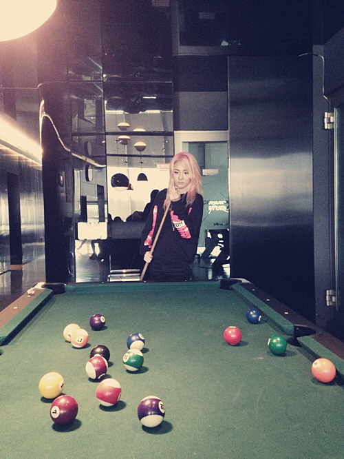 게재된 사진 속에는 노랗게 염색한 긴 머리를 풀어헤친 산다라박이 YG사옥 내 구비된 당구장에서 포켓볼을 치며 여가시간을 보내고 있는 모습이다.