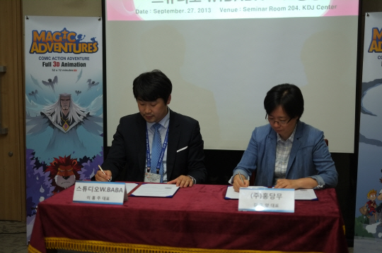 영어학습 콘텐츠 개발사 홍당무와 3D 애니메이션 제작사 스튜디오더블유바바가 3D TV애니메이션 '매직 어드벤쳐'를 제작하기로 협약을 체결했다. 사진제공=스튜디오더블유바바