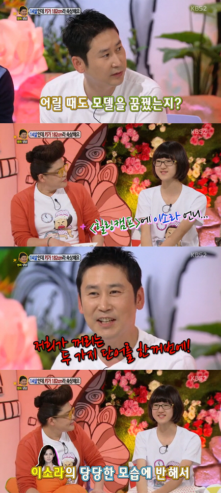 이날 박수연 양은 "또래 친구들은 평균 165cm 정도 된다. 남학생들 포함해서도 제일 크다"며 고충을 토로했다. 또 "조금이라도 작아 보이려고 혹시나 작아질까 정수리를 꾹꾹 누르고 다닌다. 앞으로도 더 클 거라더라"고 털어놨다.