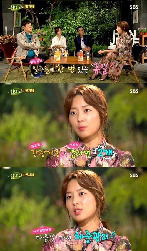 이날 MC 이경규는 한지혜에게 "몸매는 어떻게 관리하느냐"고 물었고, 옆에 있던 MC 성유리도 "허리가 22인치더라"고 놀라워하며 궁금해 했다.