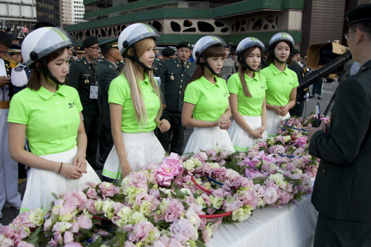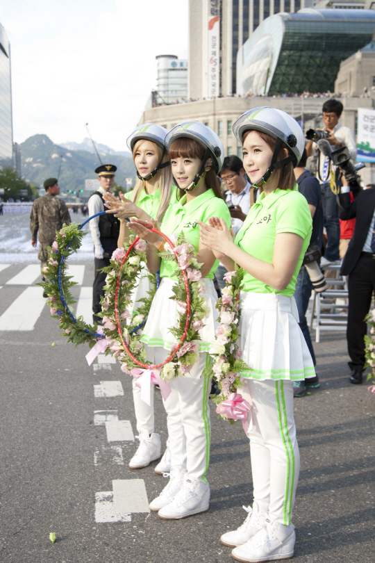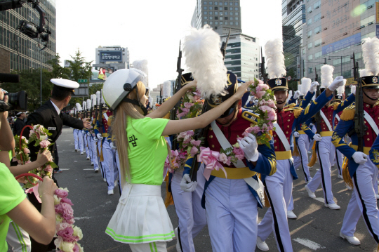 크레용팝 멤버들이 시가행진하는 군인들에게 꽃으로 만든 목걸이를 걸어주자 군인들의 얼굴에는 미소가 번졌다.